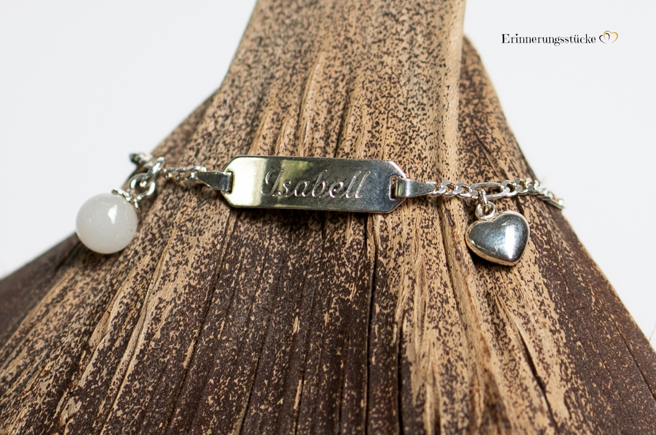 Das Sterling Silber Armband für Kinder ist 14 cm lang und hat zusätzlich ein kleines Herz als Einhänger und eine Muttermilchperle .